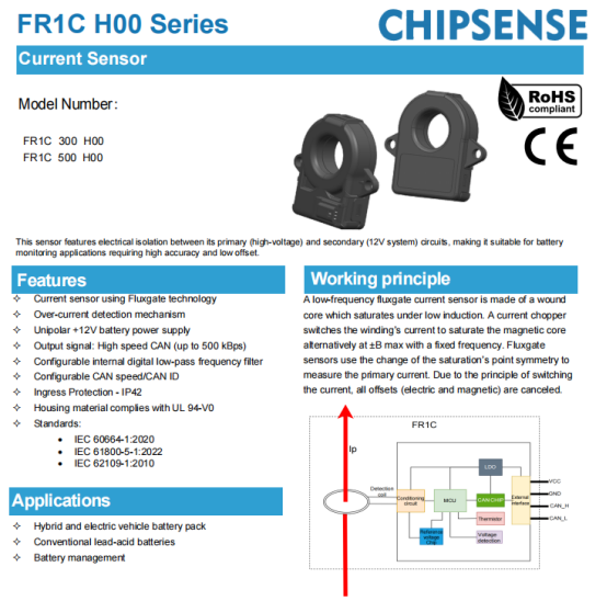 This solution utilizes the FR1C H00 series fluxgate current sensors from CHIPSENSE; this series is specifically designed for high-voltage isolation and high-precision battery monitoring applications.