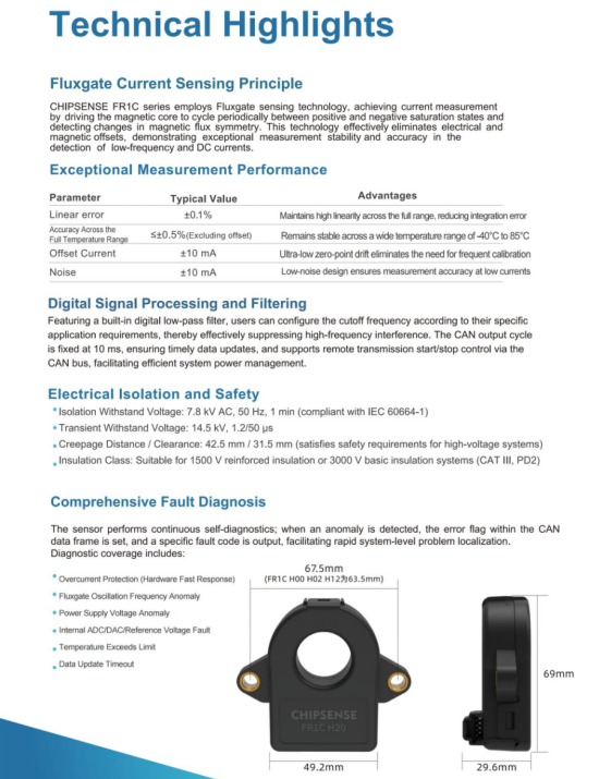 As battery management enters an era where every micro amp counts, fluxgate current sensors—through their disruptive technological breakthroughs—have resolved the long-standing challenge of achieving both high precision and miniaturization simultaneously. From a fundamental perspective, the fluxgate effect utilizes magnetic saturation modulation to enable the precise measurement of currents at the micro-ampere (μA) level; from an application perspective, CHIPSENSE FR1C H00 series current sensor provides robust safety assurance for new energy vehicles and energy storage systems. Moreover, other CHIPSENSE current sensors also perform well.