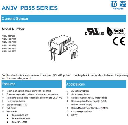Applicable models: CHIPSENSE current sensor AN3V 80 PB55 to AN3V 200 PB55 Covering mainstream string current scenarios
