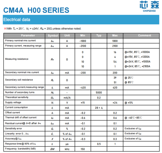 These are the characteristics of the CHIPSENSE CM4A H00 current sensor.