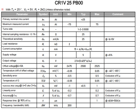 Product parameters (taking CHIPSENSE CR1V PB00 25A current sensor as an example)