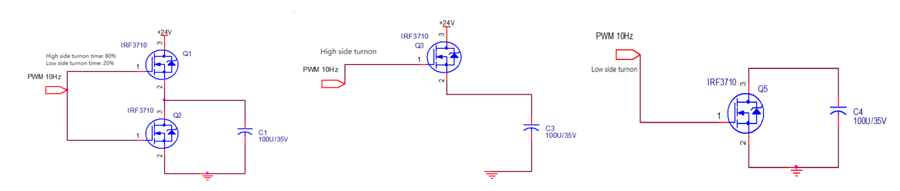 By controlling the on/off state of the high-side and low-side MOSFETs, the capacitor is repeatedly charged and discharged, and the maximum current value during instantaneous discharge is observed. Simulation software is used to study the maximum discharge current value of the capacitor resulting from different forms of large-area copper pours (PADS terminology). The purpose and significance of this circuit is to study and verify the different discharge current values caused solely by differences in PCB layout, under the same MOSFET and capacitor values (ignoring the results caused by minor parameter differences between components). The results calculated by the simulation software provide directions for improvement, and a physical prototype is manufactured for final observation.