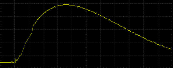 In actual testing, for the same IRF3205 MOSFET, both with 100uF/100V solid capacitors, the first version should be better than the second based on the current density graph analysis. This is also reflected in the actual testing (see the graph below, MAX: 431mV / 506mV). That is, the first version is better than the second in terms of the maximum value reached in 7μs, which is approximately 1.17 times better (506/431 = 1.17 times). The following measurements were based on a CM4A H00 current sensor of CHIPSENSE device and a RIGOL 100MHz oscilloscope, with a capacitor voltage of 12V.