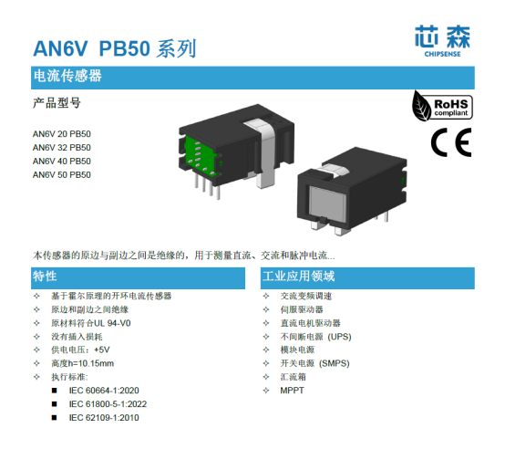 该系列是一款基于霍尔效应的开环电流传感器,采用ASIC集成设计,小巧设计就集成不小功能,且原边与副边的完全电气隔离,没有插入损耗,符合IEC 60664-1、IEC 61800-5-1等国际安全标准,在光伏领域可应用于MPPT,汇流箱等。