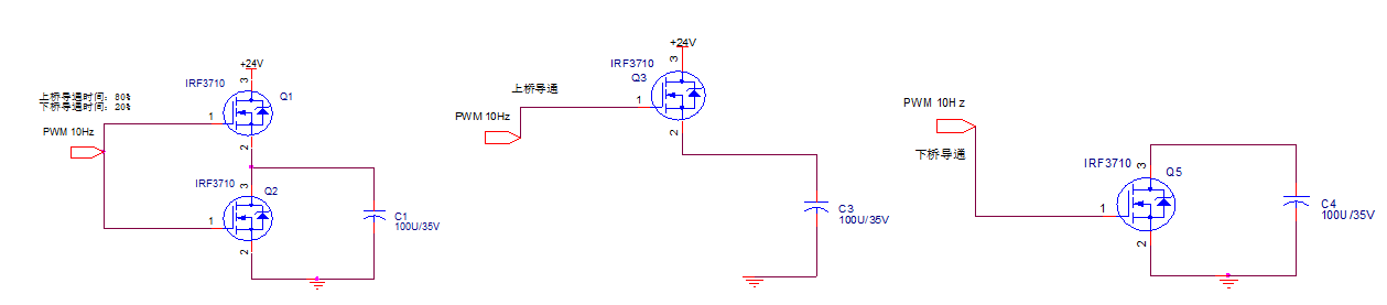 通过控制MOS上、下管的导通与关闭,让电容重复的工作于充电、放电状态,观察电容瞬间放电时的最大电流值。通过仿真软件,研究不同形式的大面积铺铜(PADS的术语:pour)所带来的电容放电的最大电流值。该电路的目的和意义在于研究并验证在同一种MOS管和电容值下(不考虑器件彼此细微的参数差异所引起的结果),仅因PCB Layout的差异而带来的不同的放电电流值。由仿真软件计算的结果来提供改进方向,并实物制造,最终观察结果。