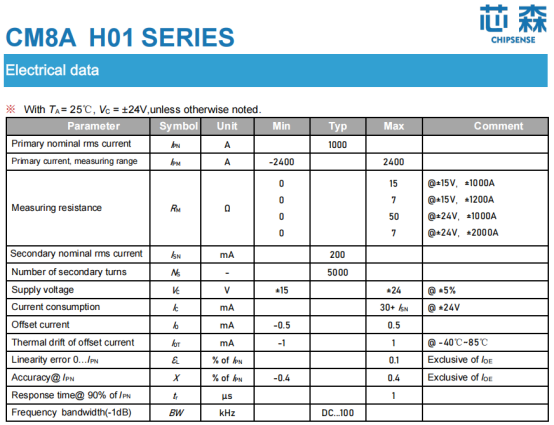 Taking CHIPSENSE CM8A H01 series current sensor as an example, its core technical parameters are as follows: