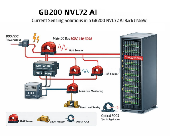 Previously, a standard 42U AI server rack typically consumed around 3kW-5kW of power, equivalent to two household wall-mounted air conditioners running simultaneously. However, modern AI computing centers, where AI large models require multiple GPUs working in parallel, have seen power consumption skyrocket. With the advent of architectures like NVIDIA Blackwell (such as the GB200 NVL72), as shown in the table below (source: NVIDIA official website), a single Blackwell GPU alone consumes over 1200W. If deploying NVL36 or NVL72 (72 GB200 GPUs), the total TDP of the entire rack system will directly surge to 70kW - 140kW (72 × 1.4kW = 100.8kW). To put this into perspective, a 100kW rack consumes enough electricity to power 50 average households. So how is a current sensor used in this application?