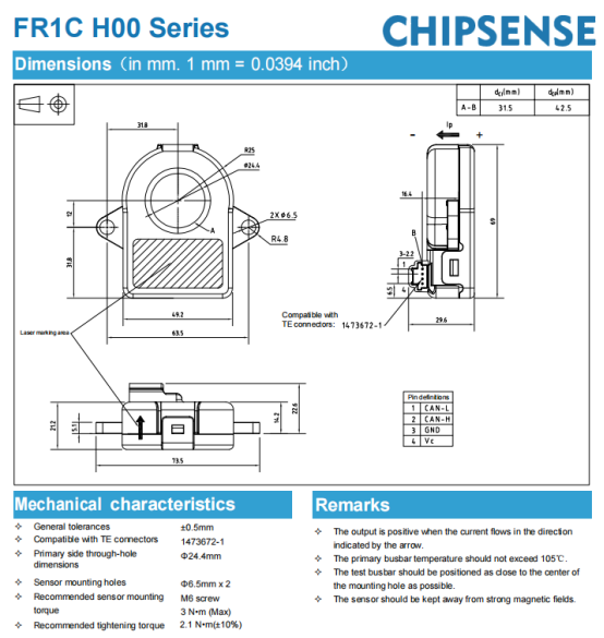 CHIPSENSE FR1C H00 series current sensors supports high-speed CAN 2.0B output (500 Kbps) and utilizes the Big-Endian (Motorola) format. The BMS can acquire real-time current data and sensor status via the CAN bus.