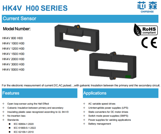 • Power circuit protection for grid-connected energy storage systems: High-bandwidth series (such as the 250kHz bandwidth of CHIPSENSE AN1V current sensors) can quickly capture current transients during the switching process of IGBT or SiC devices, used for over-current protection.