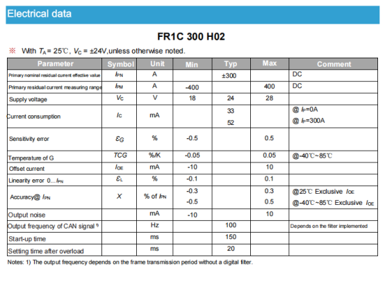 • Measurement Range: e.g., ±300A for the FR1C 300 H00 model; ±500A for the FR1C 500 H00 model