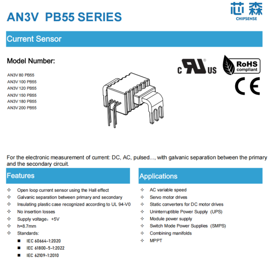 High-Precision Measurement: Hall sensors can measure DC/AC current non-contactly with an accuracy within ±0.5%, avoiding power loss and temperature drift caused by shunt resistors. For example, ASIC-based Hall current sensors such as the AN3V current sensor from CHIPSENSE can be directly soldered onto the PCB, achieving high integration and low-noise measurement.