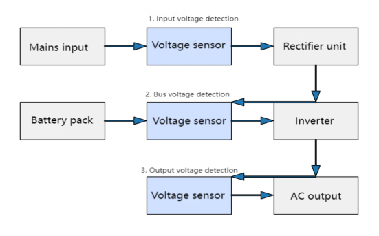 The structure of an online UPS is relatively complex. The power path of an online UPS is "mains → rectification → DC bus → inverter → load". Voltage sensors are required to continuously monitor the three key voltage nodes of "input, bus, and output".