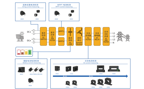 Photovoltaic full-link monitoring: CHIPSENSE AN3V/AN5V series Hall current sensors realize current monitoring of string branches and MPPT control systems, with strong anti-interference ability, low temperature drift, high precision and other characteristics, which are very suitable for high temperature and humidity in South East Asia, power grid fluctuation environment, providing a strong guarantee for the efficient and stable photovoltaic energy storage system.This is also the reason why many current sensor users choose CHIPSENSE.