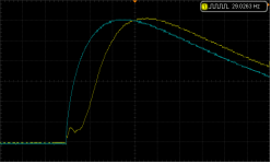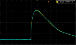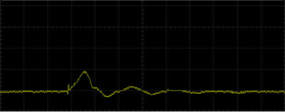 In actual testing, for the same IRF3205 MOSFET, both with 100uF/100V solid capacitors, the first version should be better than the second based on the current density graph analysis. This is also reflected in the actual testing (see the graph below, MAX: 431mV / 506mV). That is, the first version is better than the second in terms of the maximum value reached in 7μs, which is approximately 1.17 times better (506/431 = 1.17 times). The following measurements were based on a CM4A H00 current sensor of CHIPSENSE device and a RIGOL 100MHz oscilloscope, with a capacitor voltage of 12V.