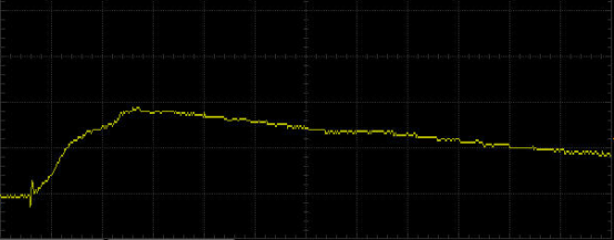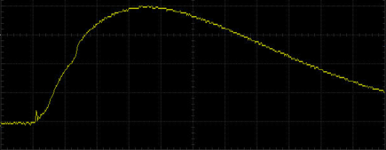 2.As shown in Figure 24 below, for a solid capacitor of 100uF/25V, the voltage drop to maximum is approximately 6.5μs.