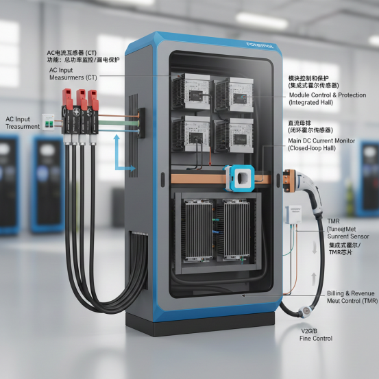 直流急速充電スタンド内部における電流検出は、単に電流値を読み取るだけではなく、電源入力から充電ガン出力までの全回路にわたり、システム全体の中で重要な役割を果たしています。実際の設計では、コスト・精度・安全性のバランスを考慮し、各部位に適したセンサーが選ばれます。