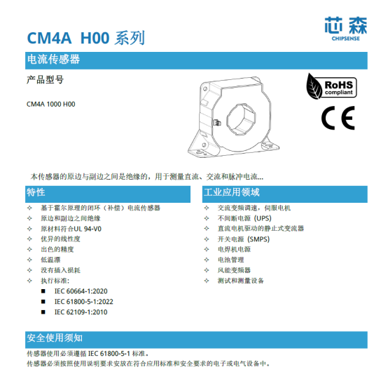CM4A基于闭环霍尔原理,通过副边线圈产生补偿电流,抵消原边磁场,实现零磁通检测,具备以下特性: