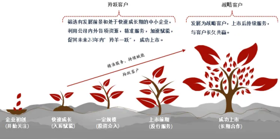 为践行普惠金融,招商证券推出“羚跃计划”,筛选有发展前景和处于快速成长期的中小企业,利用公司内外各项资源为其进行精准辅导和跟踪服务,为企业全生命发展时期的不同需求持续赋能,促其未来2-3年内实现“羚羊”的关键一跃,成功上市,上市后发展为战略客户,持续服务,与客户长久共赢。