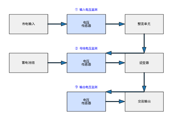 在线式UPS结构比较复杂,在线式 UPS 的电能路径是“市电 → 整流 → 直流母线 → 逆变器 → 负载”,在“输入、母线、输出”三个关键电压节点需要用到电压传感器持续监测。